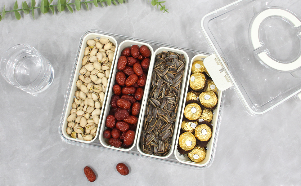 Keep snacks fresh and neatly separated with this 4-divided tray. Comes with a secure lid and easy-carry handleβperfect for home, travel, and parties.