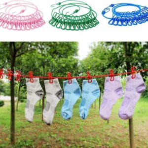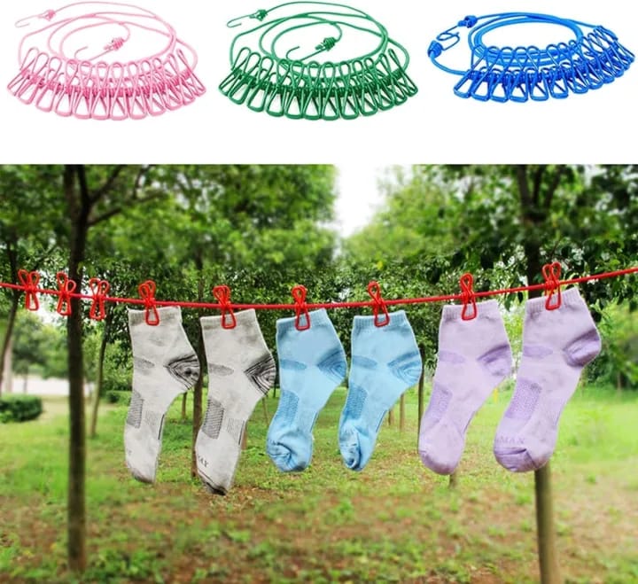Dry your clothes easily anywhere with this durable clothes hanging rope featuring 12 strong clips. Perfect for home, balcony, bathroom, or travel use. Lightweight, stretchable, and easy to install for convenient laundry drying.